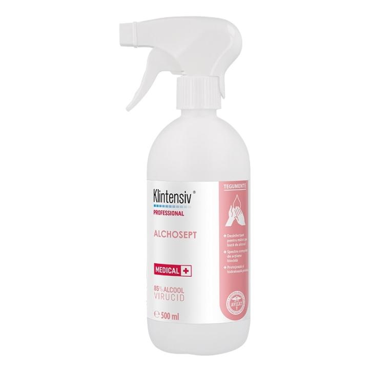 Este un dezinfectant de maini, de generatie noua, ce combina un efect microbian cuprinzator cu proprietati excelente de protectie si ingrijire a pielii. Asigura dezinfectia igienica a mainilor in doar 30 de secunde si are eficacitate biocida cu efect remanent de 3 ore de la aplicare.  KLINTENSIV ALCHOSEPT? este un produs de curatare cu actiune rapida, fiind ideal pentru utilizari frecvente in cabinetele medicale, saloane cosmetica, saloane coafura, frizerii, pentru curatarea mainilor inainte si dupa fiecare contact cu pacientul.