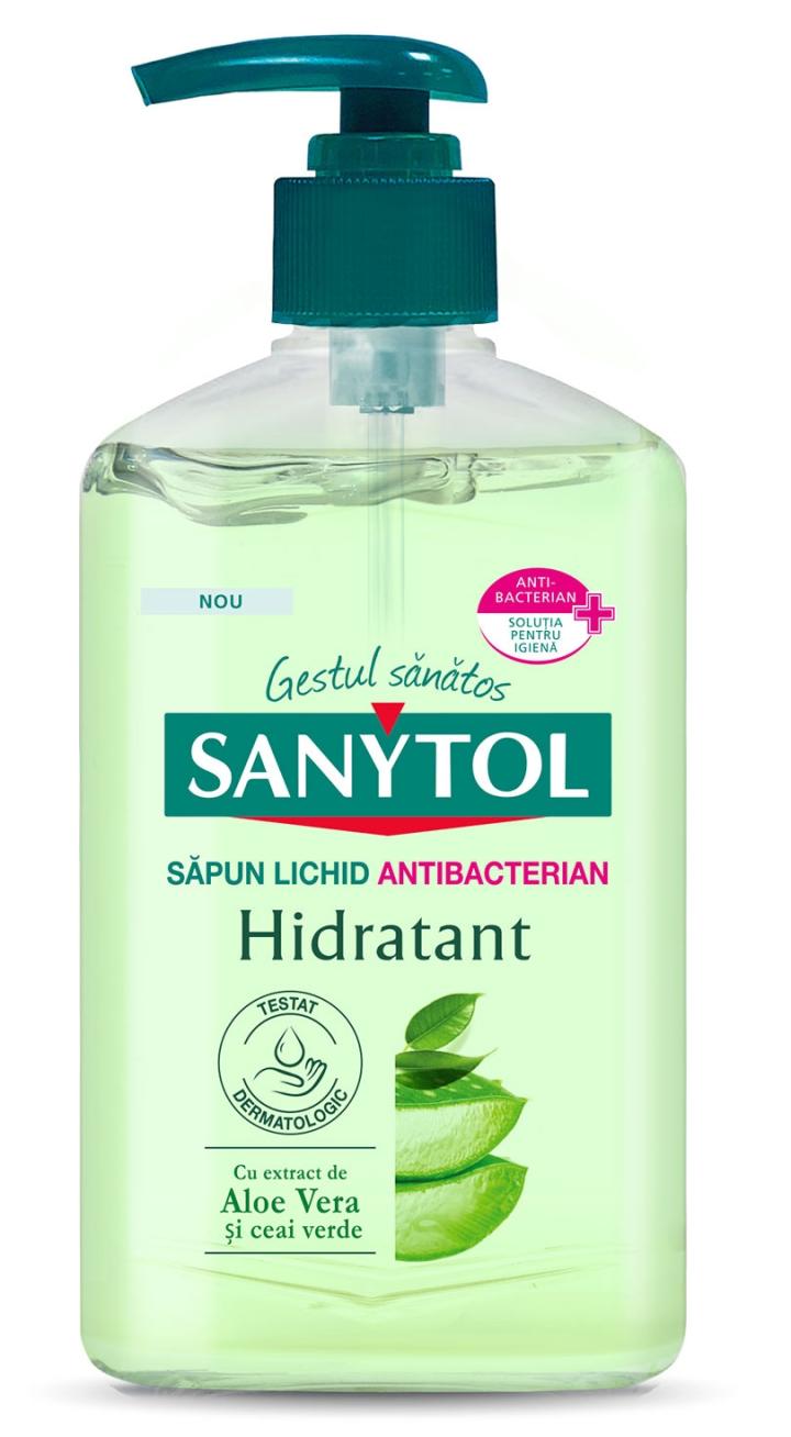 Sanytol - Sapun Lichid Antibacterian - Hidratant - 250 ml  Sanytol Sapun Lichid Antibacterian Hidratant este conceput pentru igiena zilnica a mainilor, principala cale de transmitere a infectiilor. Formula sa hipoalergenica, testata clinic si dermatologic, este imbogatita cu extracte naturale de Aloe Vera si ceai verde, cunoscute pentru proprietatile calmante si hidratante. Curata delicat, respecta pielea sensibila si lasa mainile curate si placut parfumate.
